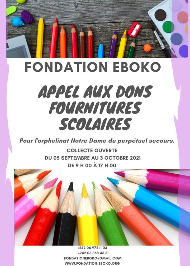 Vous pouvez également apporter vos fournitures (neuves ou non utilisées) du 5 septembre au 3 octobre 2021, de 9h à 17h au siège de la Fondation Eboko à Kombo.