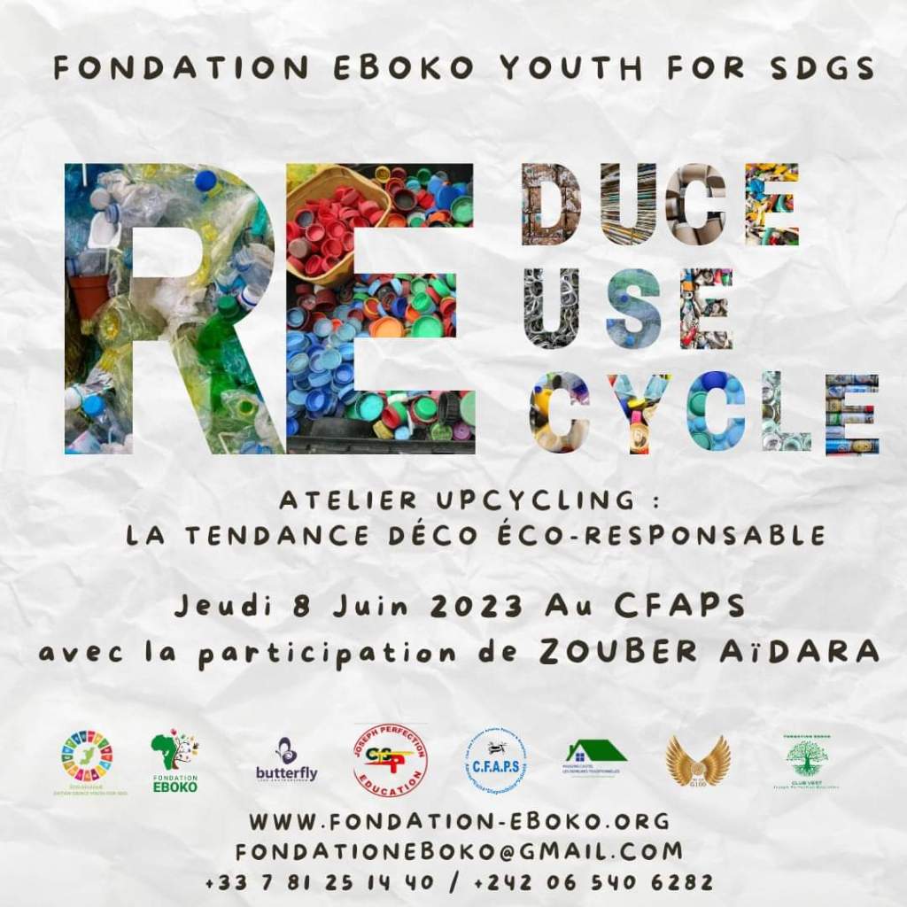 Le 8 juin, en l’honneur de la Journée Mondiale de l’Environnement, la Fondation Eboko Youth for SDGs organisera un atelier sur L’Upcycling: la tendance déco éco-responsable pour les enfants de l’école Joseph Perfection Éducation au sein du CongoBrazza Cfaps Cfapsofficiel à Brazzaville.