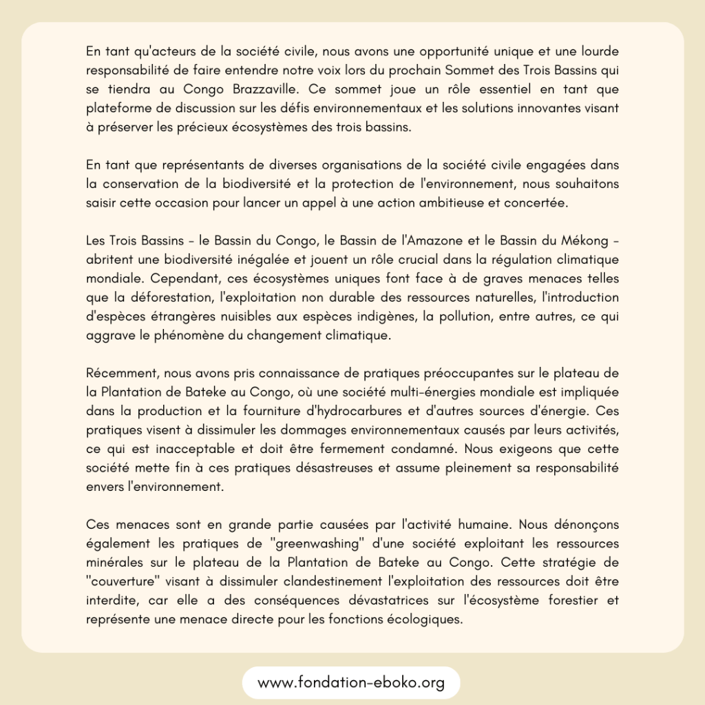 Aujourd’hui, en tant que membres engagés de la société civile, nous souhaitions mettre en lumière l’importance cruciale du récent sommet des trois grands Bassins forestiers tropicaux du monde. En nous réunissant en tant que défenseurs de la nature et de l’environnement, nous étions déterminés à faire entendre nos voix et à agir pour créer un réel changement.