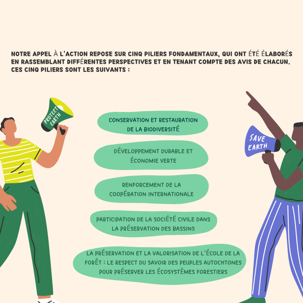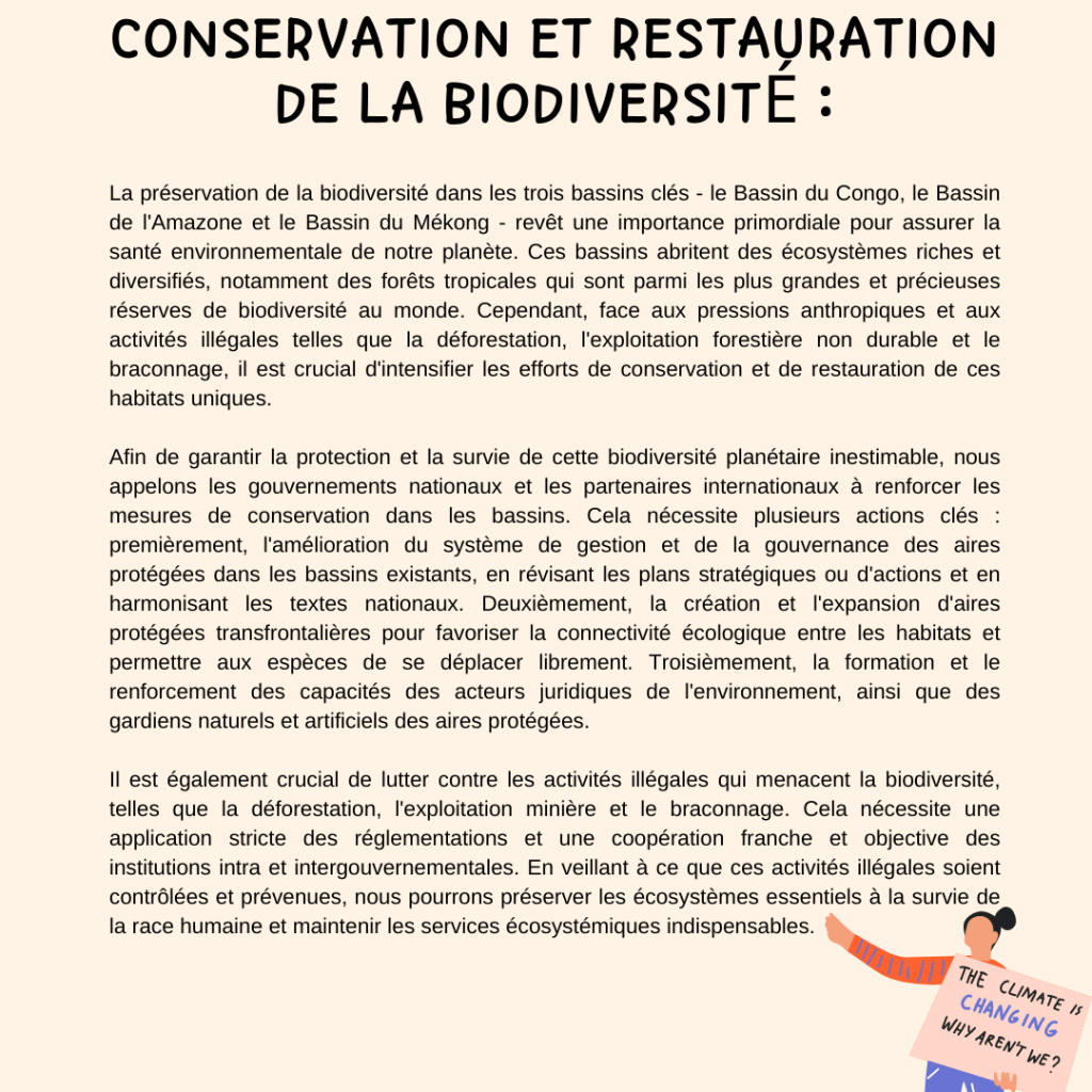 Ce sommet représentait une opportunité cruciale de discuter des problématiques qui affectent les bassins du Congo, de l’Amazonie et du Mékong, et de trouver des solutions durables. Avant le sommet, nous avions formulé cinq axes prioritaires dans notre pétition, car nous croyions en leur importance pour assurer un avenir meilleur pour ces écosystèmes vitaux.